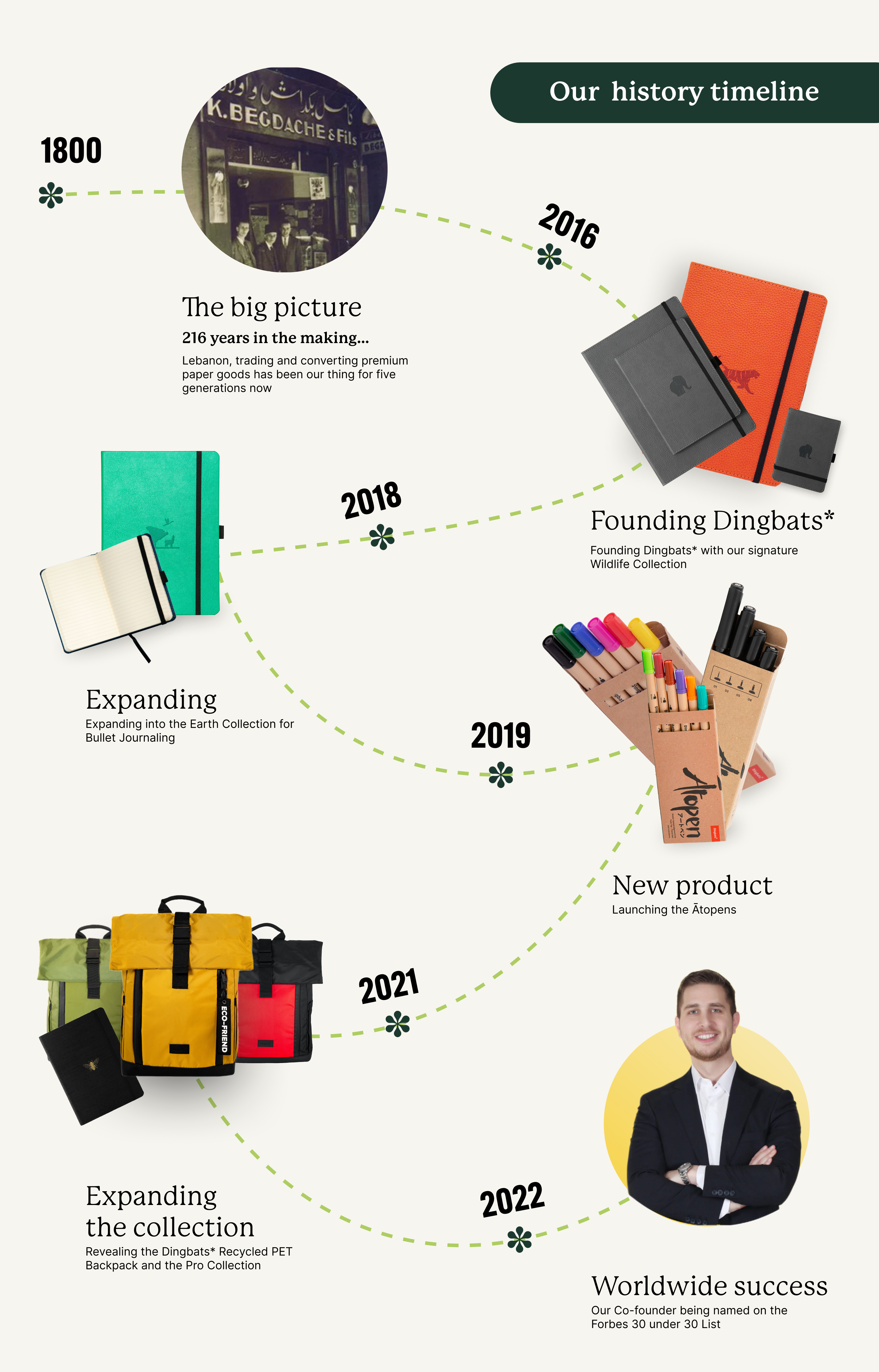 Just happy to be part of something greater. Though the Dingbats* journey officially began back in March 2016, our passion stems from a long family tradition that proudly celebrates craftsmanship, quality and ingenuity. As part of SKB, the oldest established company in Lebanon, trading and converting premium paper goods has been our thing for five generations now (since 1800). And today, we still draw on this expertise in everything we produce; from top-quality notebooks to backpacks and pens.