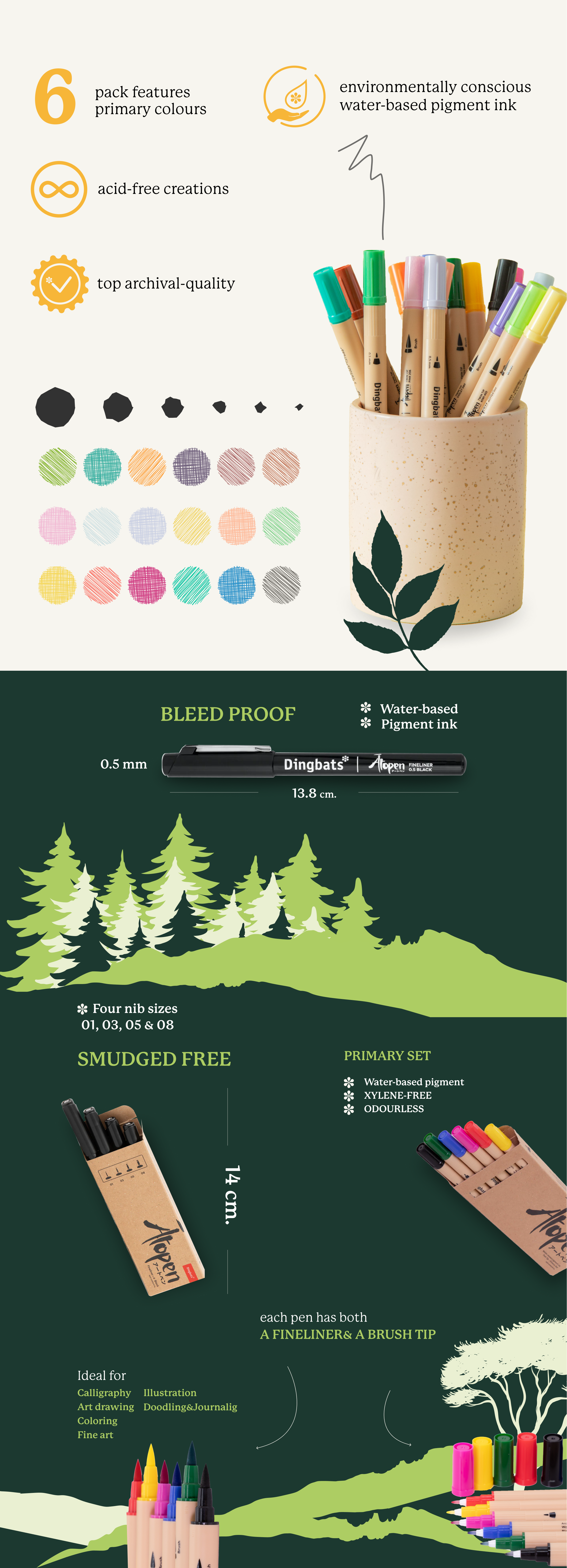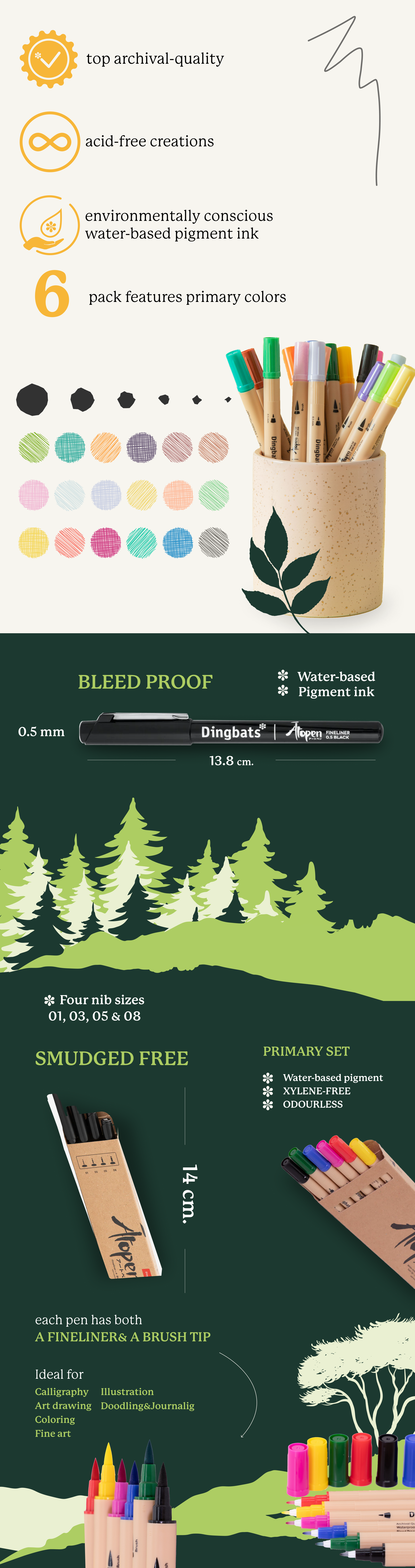 Ideal for calligraphy, art drawings, colourings, illustrations, fine art, doodling, and journaling, our Ātopens all filled with environmentally conscious water-based pigment ink that allows you to make fadeproof, acid-free creations that are of top archival-quality.